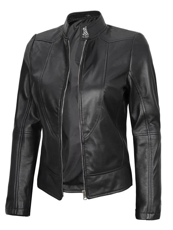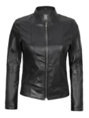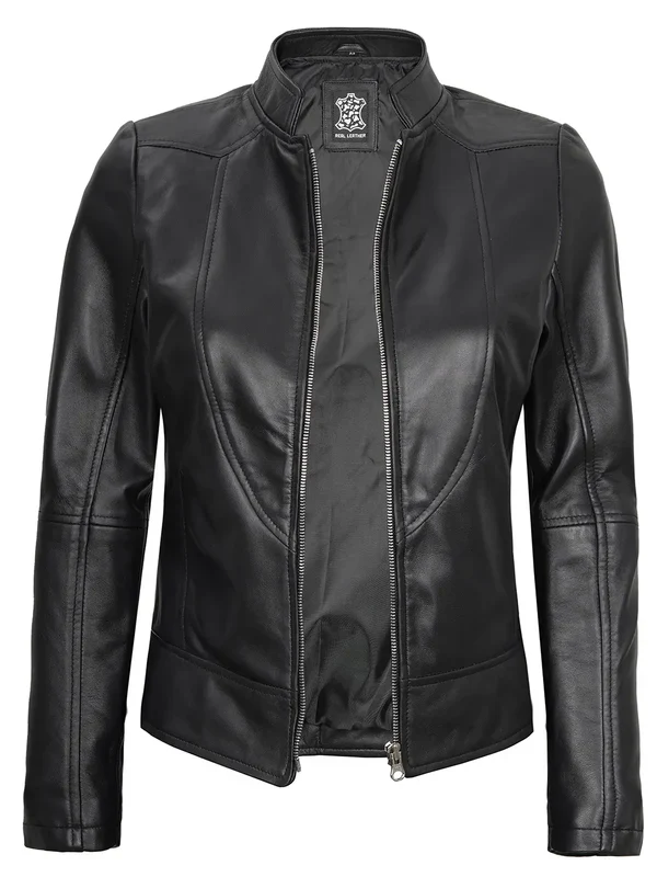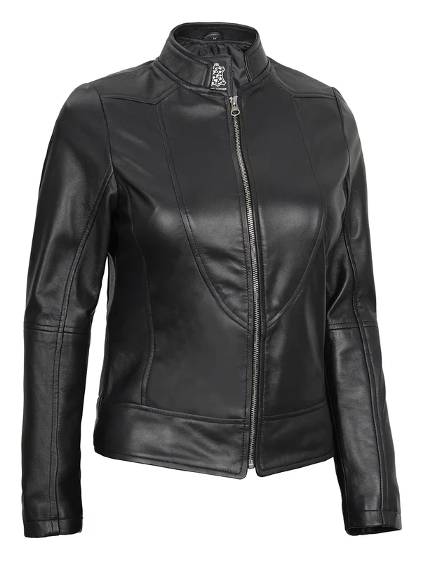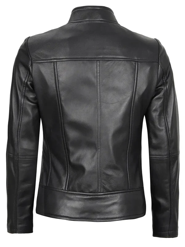 Sleek, structured, and versatile the Amy Women’s Black Cafe Racer Leather Jacket is your go-to for modern edge. Crafted from 100% real lambskin leather with a soft polyester lining, it features a clean mandarin collar and zip closure for a refined silhouette. Making it perfect for everyday confidence.