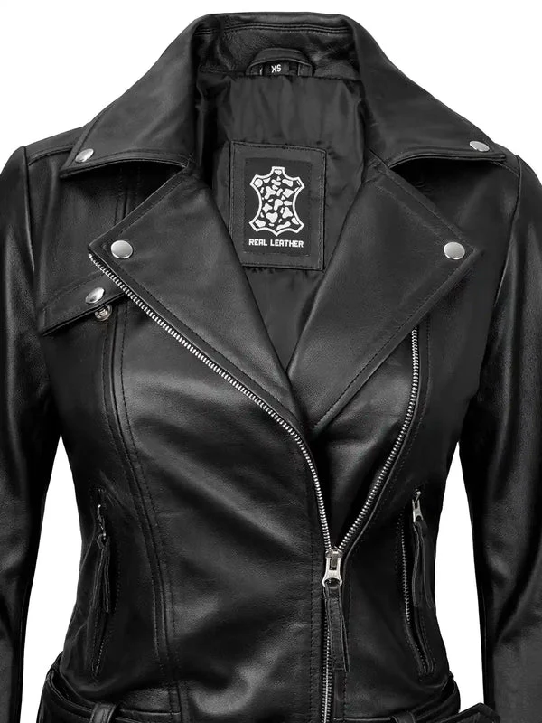 Enhance your fashion with the Women’s Black Biker Leather Jacket. Features an asymmetrical zipper, zipper pockets, and polyester lining for comfort. Perfect for motorcycle enthusiasts or trendsetters, this jacket exudes confidence and attitude with its edgy design and sleek black leather. Enhance your style with this contemporary addition!