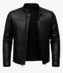 Channel your inner rebel with this men’s black cafe racer jacket crafted from hand-picked lambskin leather. Features a snap-tab collar, zipped closure, and a minimalist design with a single chest zip pocket. Perfect for urban rides or casual outings.