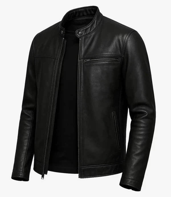 Channel your inner rebel with this men’s black cafe racer jacket crafted from hand-picked lambskin leather. Features a snap-tab collar, zipped closure, and a minimalist design with a single chest zip pocket. Perfect for urban rides or casual outings.