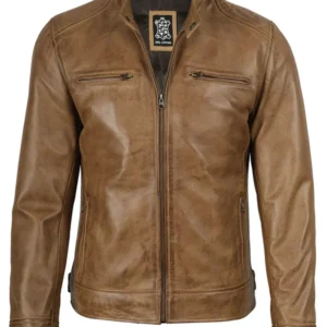Dodge Men’s Camel Brown Leather Cafe Racer Jacket