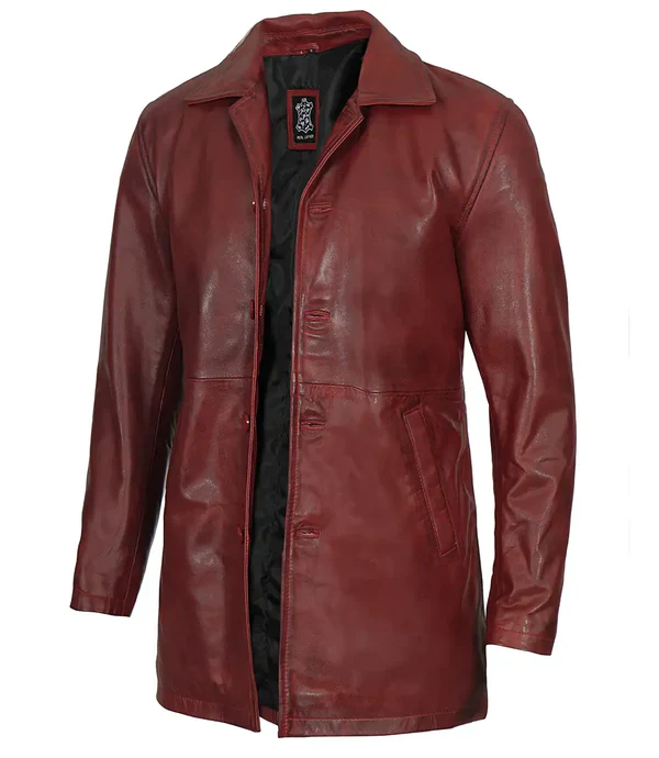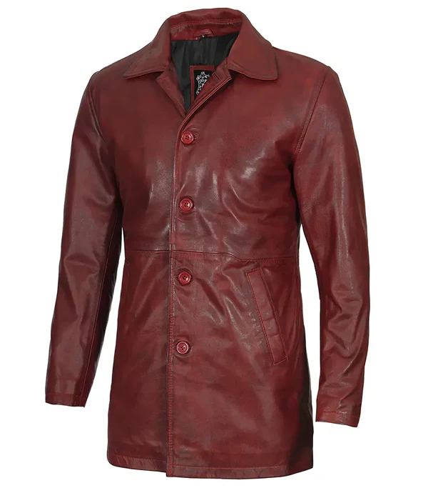 Add smartness and style with this Burgundy classic car coat. 100% real lambskin leather detailed with button closure, functional pockets, spread collar, and extended mid-thigh length. Further smarten up the getup with pair of matching shoes and jeans.