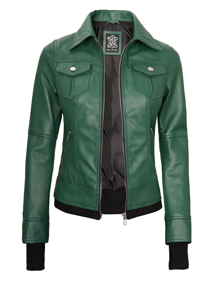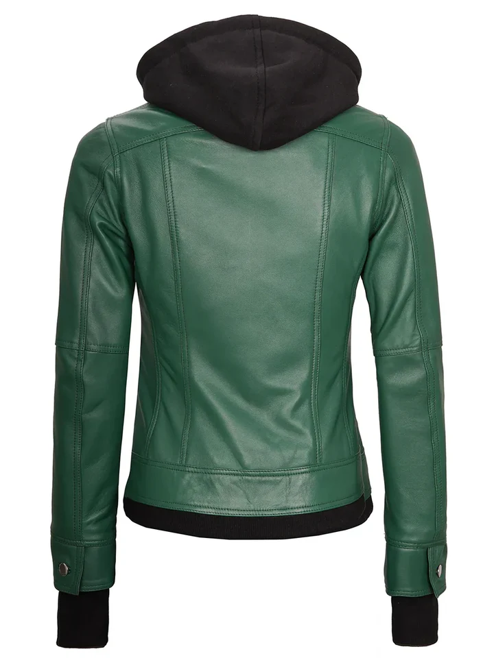 Amp up your outerwear with the Tralee Green Biker Style Jacket, crafted from real lambskin and finished with a detachable hood. Thumbhole sleeves ensure a snug fit, while a mix of zip and flap pockets delivers both utility and edge. A fresh take on biker style in a striking green shade.