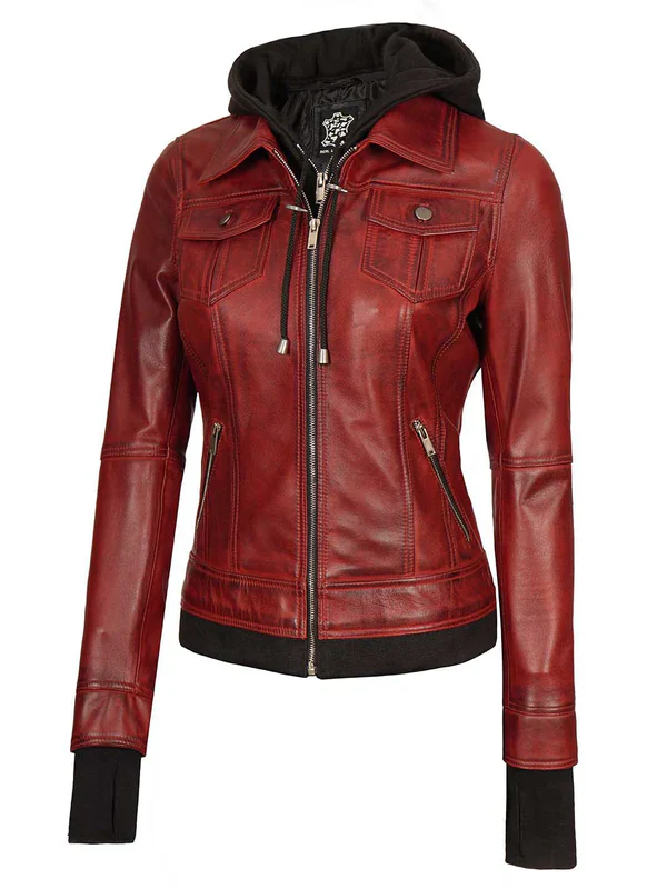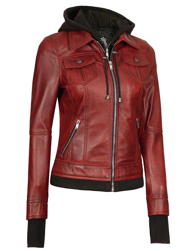 - Bold Maroon Color – Stand out with riTralee Women’s Maroon Bomber Leather Jacket with Hoodch burgundy shade