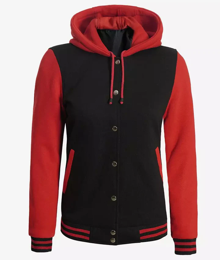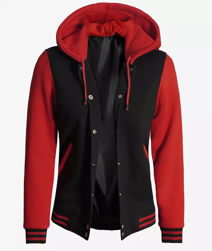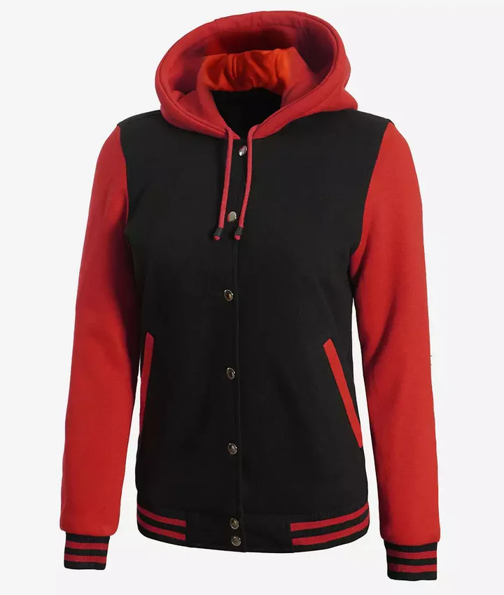 Elevate your casual style with this Women’s Black and Red Varsity Jacket. Designed for both fashion and function, it features a classic baseball-inspired look with an attached hood for extra versatility. Made from premium fleece, it ensures warmth, comfort, and durability.
