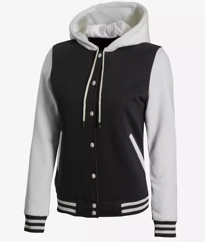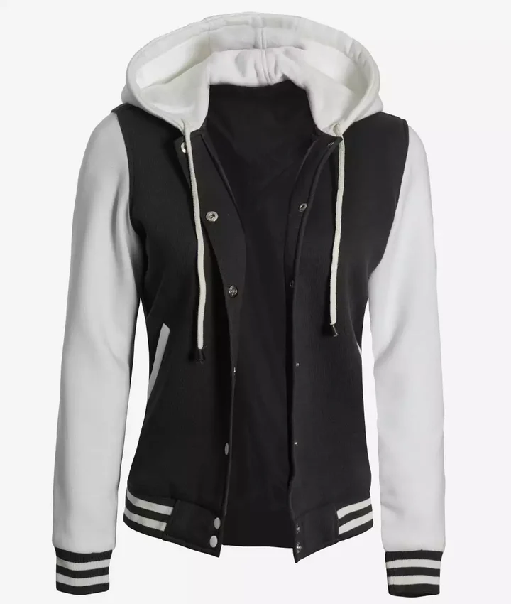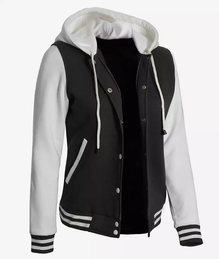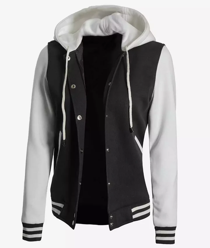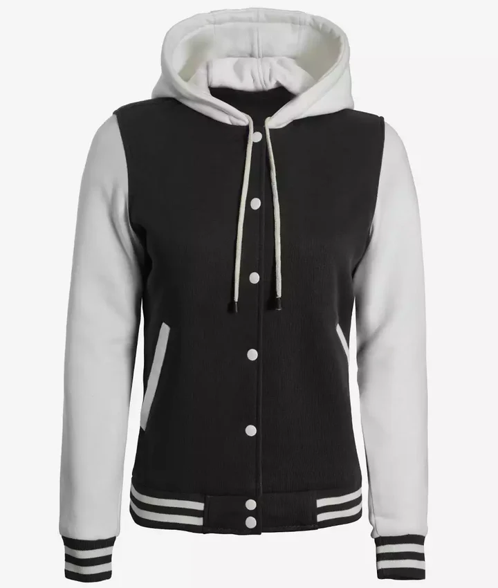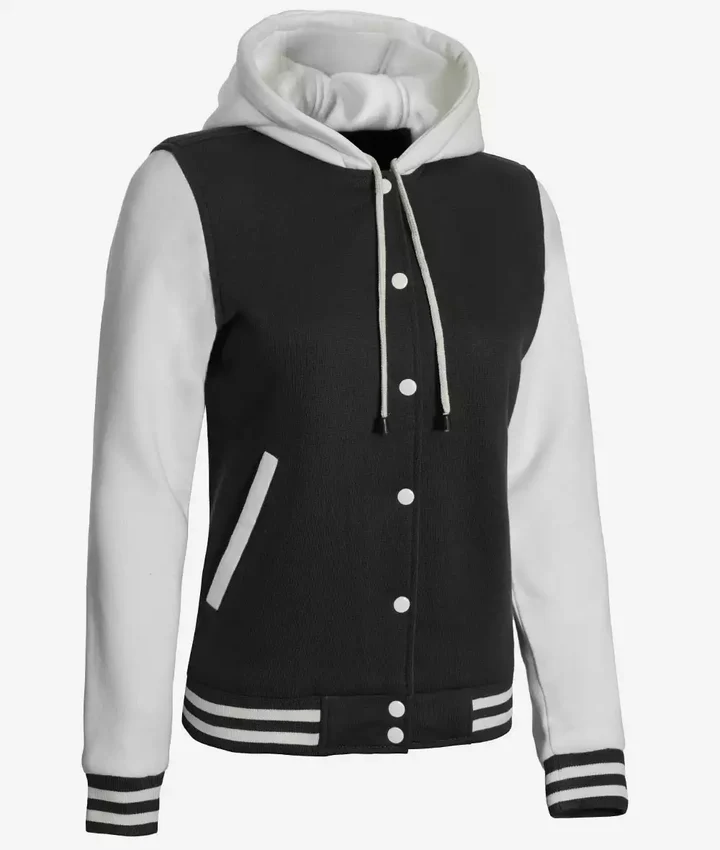 Stay stylish and comfortable with this Women’s Black and White Varsity Jacket. Featuring a classic bomber design with an attached hood, this jacket offers the perfect blend of sporty and chic. The versatile black and white color scheme pairs effortlessly with any outfit, making it ideal for casual outings or game days.